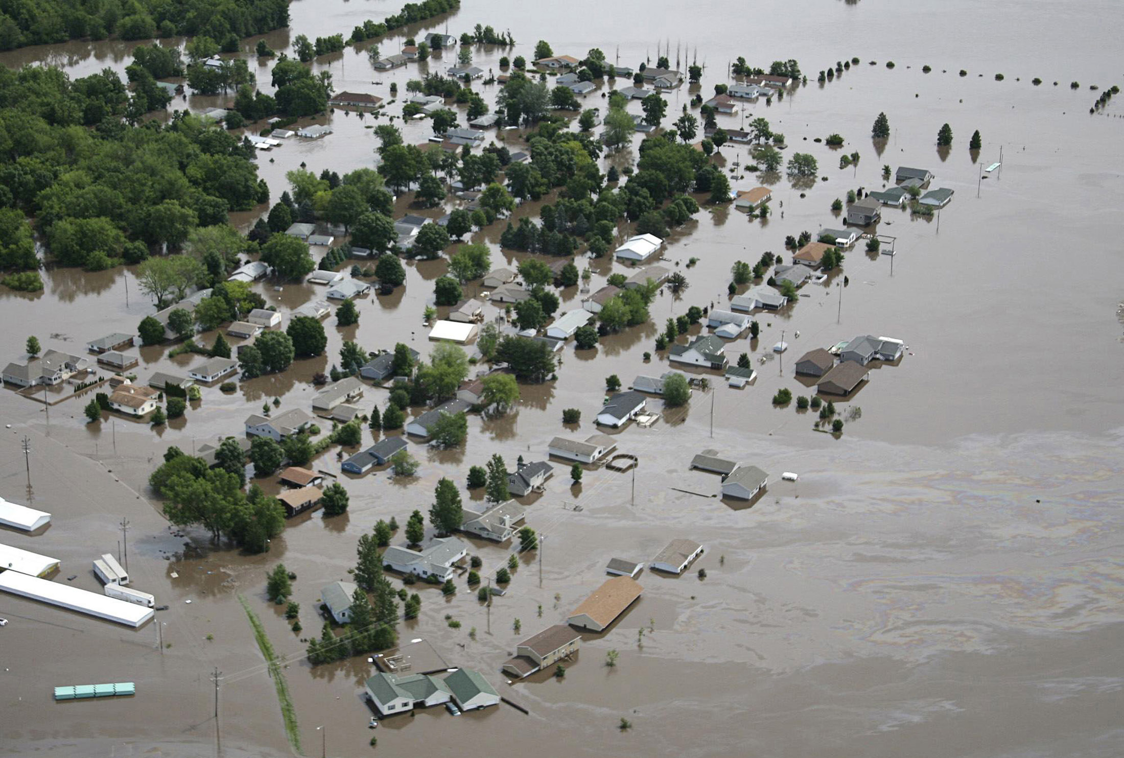 | An aerial photograph shows the flooded town of Palo, Iowa, June 13, 2008. An oil or fuel slick is visible spreading from the town over the flooded area located next to the Cedar River. Overflowing rivers in Iowa forced evacuations and disrupted the region's economy on Friday with fears of worse to come from fragile levees and more rain. Thousands were forced to leave their homes in the worst Midwest flooding in 15 years. [Agencies] |