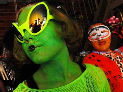 People dressed as aliens wait backstage for their turn at the costume contest at Pearson Auditorium during the UFO Festival on Saturday July 5, 2008 in Roswell, N.M. [Agencies]