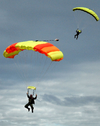 Two soldiers parachute in during anti-terrorism training in Thailand's northern province of Chiang Mai July 28, 2008. Coded "Strike-2008", the training will last twenty days from July 11. This is the first time the Chinese army has engaged in combined training conducted overseas for this length of time. [Xinhua]