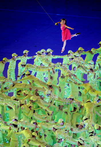 Updated: 2008-08-08 22:36 A young Chinese girl suspended in the air performs above dancers in fluorescent suits during the opening ceremony of the 2008 Beijing Olympic Games in Beijing on August 8, 2008. [Agencies] Dazzling show opens Beijing Games |
