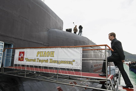 Russia's President Dmitry Medvedev visits the nuclear submarine St. George the Victor at a military base in Krasheninnikov bay in the Kamchatka peninsula, September 25, 2008. [Agencies]