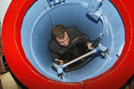 Russia's President Dmitry Medvedev visits the nuclear submarine St. George the Victor at a military base in Krasheninnikov bay in the Kamchatka peninsula, September 25, 2008. [Agencies]