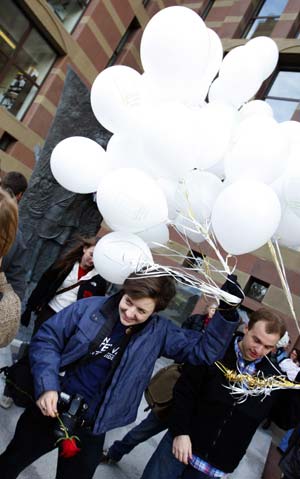 Updated: 2008-11-13 09:48 A supporter of gay marriage carries a rose and balloons outside New Haven City Hall in New Haven, Connecticut, November 12, 2008. Dozens of gay and lesbian couples planned to wed in Connecticut on Wednesday after a judge cleared the way for the state to become the nation's second to allow same-sex marriage. [Agencies] |