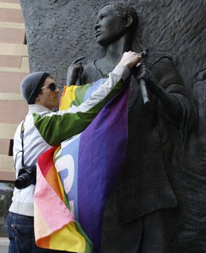 J.P. Jewel, a supporter of gay marriage, hangs a rainbow flag on a statue outside New Haven City Hall in New Haven, Connecticut, November 12, 2008. Dozens of gay and lesbian couples planned to wed in Connecticut on Wednesday after a judge cleared the way for the state to become the nation's second to allow same-sex marriage. [Agencies]