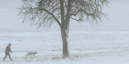 A man walks with his dog through the snow covered landscape on a cold and windy day outside Egg, near Zurich November 22, 2008. [Agencies]