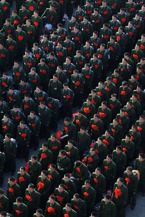 Updated: 2008-11-25 22:21 ![]() Ex-servicemen who completed their military service attend a ceremony before leaving the army in Yinchuan, Northwest China's Ningxia Hui Autonomous Region, November 25, 2008. [Xinhua]