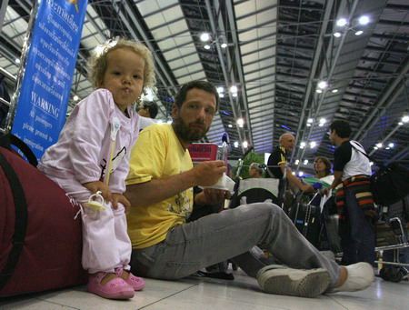 A tourist and his daughter eat dinner inside Bangkok's Suvarnabhumi international airport after anti-government protesters blocked the main road November 25, 2008. Flights were cancelled at Thailand's main airport on Tuesday after anti-government protesters stormed the building, leaving thousands of travellers stranded and threatening the country's tourism industry. [Agencies]