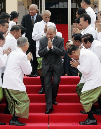 Updated: 2008-12-03 17:15 Cambodia's King Norodom Sihamoni (C) is greeted by parliamentarians after opening the first parliamentarian meeting to form a new government after the national elections in July at the national assembly building in Phnom Penh September 24, 2008. [Agencies] |