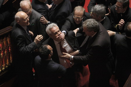 Udeur senator Tommaso Barbato (L) is held while being removed from a confidence vote session at the Senate in Rome January 24, 2008. Prime Minister Romano Prodi made a final plea for Italy's parliament to back his government on Thursday in a confidence vote he looked set to lose, saying the economy could not bear more political uncertainty.[Agencies] |