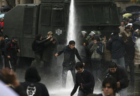 Updated: 2008-12-05 17:43 ![]() A student is hit by a water cannon fired by riot police during a rally in Santiago June 4, 2008. Groups of students clashed with Chilean riot police on Wednesday to protest against a proposed education reform. [Agencies]