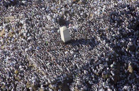 An aerial view of Muslim pilgrims on Mount Mercy outside Mecca December 7, 2008. More than two million Muslims began the haj pilgrimage on Saturday, heading to a tent camp outside the holy city of Mecca to follow the route Prophet Mohammad took 14 centuries ago. [Agencies]