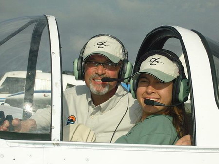 Jessica Cox, 25, a girl born without arms, smiles with her instructor Parrish Traweek inside an aircraft in this undated photo. The girl from Tucson, Arizona got the Sport Pilot certificate lately and became the first pilot licensed to fly using only her feet. [CFP]