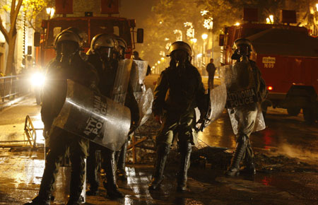 Policemen in riot gears take position during riots in Athens, December 8, 2008. Thousands of protesters rampaged through the heart of Athens on Monday, burning and looting shops on a third day of riots sparked by the killing of a teenager by police. [Agencies] |