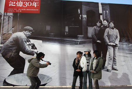 Students from Beijing Nationality University pose for pictures at a photo exhibition in the capital city's Wangfujing area on Wednesday. The show features about 800 photos taken across the country during the past three decades to highlight the major changes China has gone through since 1978. [Asianewsphoto]