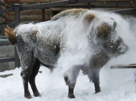 A wild bison shakes off snow in the municipal zoo Royev Ruchey during temperatures of minus 20 degree Celsius (minus 4 degree Fahrenheit) in the Siberian city of Krasnoyask, December 19, 2008. [Agencies]
