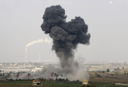 ![]() Smoke rises after an Israeli air strike in the northern Gaza Strip December 29, 2008. Israeli aircraft attacked Hamas targets in the Gaza Strip for a third day on Monday and militants launched a fatal rocket attack on Israel in defiance of an offensive that has killed more than 300 Palestinians. [Agencies]