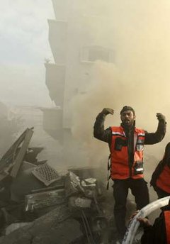 Even as it pursued its bombing campaign, Israel kept the way open for intense efforts by leaders in the Middle East and Europe to arrange a cease-fire. Israel said it would consider a halt to fighting if international monitors were brought in to track compliance with any truce. Adding to the urgency of the diplomatic maneuvering, the Israeli military said its preparations for a possible ground assault were complete and that troops stood ready to cross the border if the air operation to stamp out Hamas rocket fire needed to be expanded. Soldiers massed along the Gaza frontier said they were eager to join the fight, and some even cheered as they heard thunderous airstrikes in the distance. The hit on Rayan's home obliterated the four-story apartment building and peeled off the walls of others around it, creating a field of rubble in the crowded town of Jebaliya in the northern Gaza Strip. Mounds of debris thrown up by the blast swallowed up cars. Eighteen other people, including all four of Rayan's wives and nine of his 12 children, also were killed, Palestinian health officials said. A man cradled the burned, limp body of a child he pulled from the rubble. The house was one of five bombed Thursday, among more than 20 targets altogether. Warplanes shredded the houses, taking off walls and roofs and leaving behind eerie, dollhouse-like views into rooms that still contained furniture. Israel's military, which has said the homes of Hamas leaders are being used to store missiles and other weapons, said the attack on Rayan's house triggered secondary explosions from the arms stockpiled there. Seven other Palestinians were killed in airstrikes Thursday and one died of earlier injuries. Israel has targeted Hamas leaders many times in the past, and the current leadership went into hiding at the start of the offensive. Rayan, however, was known for openly defying Israel and in the past had led crowds to the homes of wanted Hamas figures -- as if daring Israel to strike and risk the lives of civilians. Residents said he openly went to a nearby mosque Thursday morning to pray. In his last interview, recorded with Hamas TV on Wednesday, Rayan was as defiant as ever about confronting the Israeli military. "Oh fighters, know that you will be victorious," he said. "God promises us either victory or martyrdom. God is greater than they are, God is greater than their planes, God is greater than their rockets." The military said it had information that there was a tunnel beneath Rayan's home for use as an escape route. Israel seemed determined to press ahead with airstrikes on Hamas houses. It also has been targeting buildings used by the territory's Hamas government -- emptied days ago by evacuations -- as well as rocket-launching sites and smuggling tunnels along the border with Egypt. |