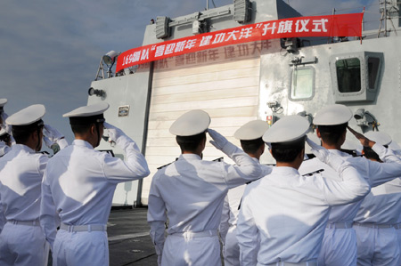 Chinese naval fleet crew members greet New Year