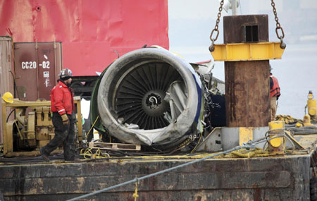 The left engine of the US Airways jetliner that crash landed in the Hudson River last week is inspected by NTSB (National Transportation Safety Board) officials after being lifted out of the water in New York January 23, 2009. [Agencies]