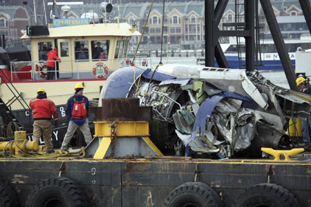 The left engine of the US Airways jetliner that crash landed in the Hudson River last week is inspected by NTSB (National Transportation Safety Board) officials after being lifted out of the water in New York January 23, 2009. [Agencies]