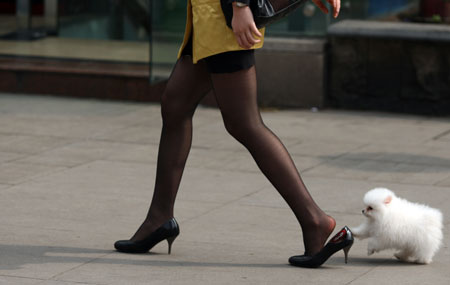 A little dog plays with its owner's high-heel shoe on a street in southwest China's Chongqing municipality, March 24, 2009. [CFP]