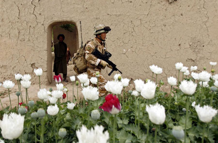 ![]() An Afghan man watches a British soldier walking past a poppy field while on foot patrol in Musa Qala, Helmand province. March 27, 2009. [Agencies]