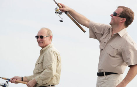 Russian Prime Minister Vladimir Putin and President Dmitry Medvedev spend a holiday together in Astrakhan, southern Russia, Aug 16, 2011. [Photo/CFP] |