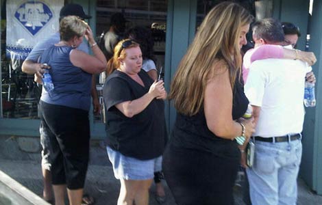 Police officers guard the entrance to Salon Meritage following a shooting that left eight people dead and another critically injured in Seal Beach, California Oct 12, 2011. A suspected gunman was arrested by officers from the Seal Beach police department, county fire authority spokesman Marc Stone told Reuters. [Photo/Agencies]