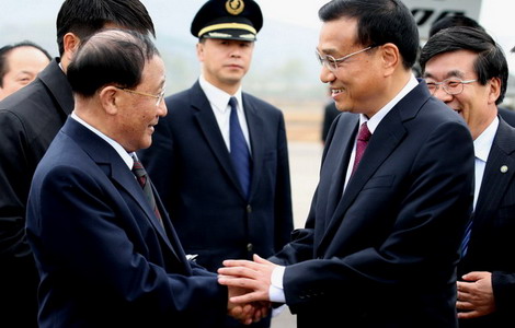 Prominent Chinese sculptor Yuan Xikun (right) and a Maldives official (left) put the sculpture of polar bears into sea, Oct 20, 2011.[Photo/Asianewsphoto/Xu Bin]