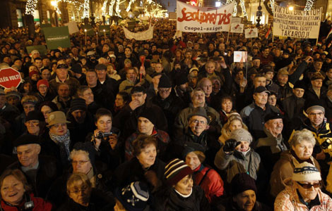 A man holds up a sign during a protest in central Budapest Jan 2, 2012. The demonstrators are protesting against the government and new Basic Law which replaced the country's constitution on Jan 1. The protest, the biggest anti-government demonstration to date which was organized by civil organizations rather than political parties, took place close to the Hungarian State Opera House where Prime Minister Viktor Orban, President Pal Schmitt and other dignitaries were attending a gala ceremony in honor of the new charter. The constitution, now called the Basic Law, has been criticized by opponents who believe it will cause lasting damage to the country's democracy. [Photo/Agencies]