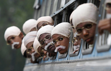Children dressed as Mahatma Gandhi take part in a peace march in Kolkata Jan 29, 2012. Four hundred and eighty-five children from the Training Resource and Care for Kids (T.R.A.C.K.S), a charity for single mothers and children living without support at railway stations, took part in a peace march on Sunday in an attempt to create a Guinness World Record for being the largest gathering of people dressed as Mahatma Gandhi. [Photo/Agencies]