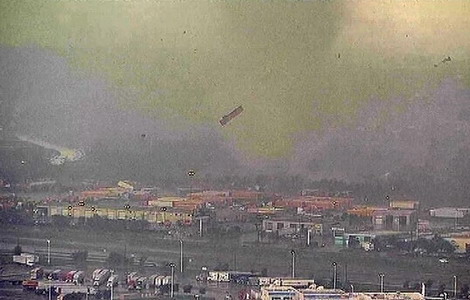 A trailer flies through the air as a tornado sweeps through the Dallas-Fort Worth area April 3, 2012 in this still image taken from video. [Photo/Agencies] |