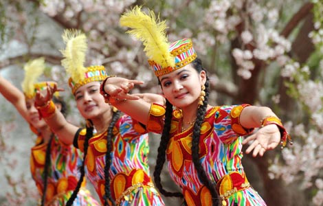 A group of dancers perform at the opening ceremony of a cultural festival in Shche county, the Xinjiang Uygur autonomous region, on April 8, 2012. The festival consists of a photo competition, a farmers' painting contest, a local snacks and handicraft s exhibition, and a folk sports event. [Photo by Jin Wei / For China Daily]