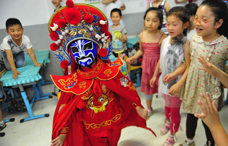 Children perform Tibetan opera for Children's Day at a primary school in Lhasa, Southwest China's Tibet autonomous region, on May 30, 2013.[Photo by Li Zhou/ Asianewsphoto] |