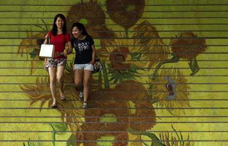 A scaled replica of the "Rubber Duck" by Dutch conceptual artist Florentijn Hofman is seen along a street next to a vendor waiting for customers in Shanghai, June 13, 2013.?[Photo/Agencies]