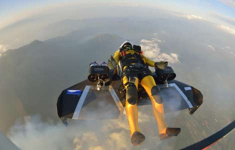 Swiss ex-pilot Yves Rossy flies over Mount Fuji in his custom-built, carbon-Kevlar, 2 meter-wide jetwing with four engines on Nov 1, 2013. The Jetman made nine flights alongside Japan's landmark during demonstration flights from Oct 28 to Nov 3.[Photo/Xinhua]