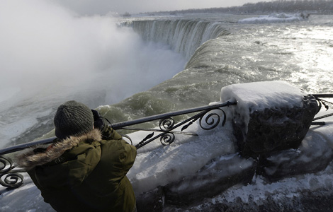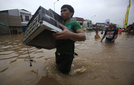 Residents wade through a flooded area in Jakarta, Jan 13, 2014. According to local media, floods caused by monsoon rains have forced thousands of people to flee their homes in Indonesia's capital, with the depth of floodwaters varying from 50 centimetres to 2 metres. [Photo/Agencies]