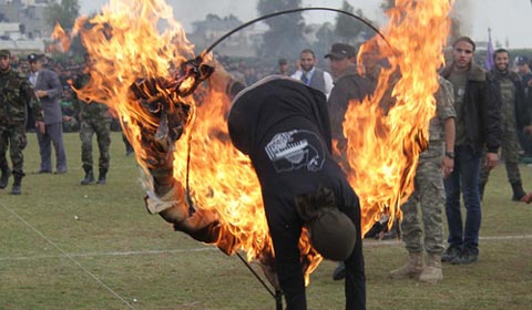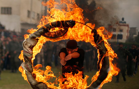 A Palestinian student jumps through a burning ring during a graduation ceremony for a military-style training programme in Gaza City Jan 14, 2014. Some 13,000 students joined the course, which is aimed at preparing them for "liberating Palestine from Israel", Hamas officials said. The course was conducted by the Hamas-run ministry of education during the school winter holiday. [Photo/Agencies] |