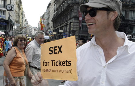 A man holds a sign offering to trade tickets at Olympic Park during the 2012 Summer Olympics Saturday, Aug. 11, 2012, in London. [icpress.cn]