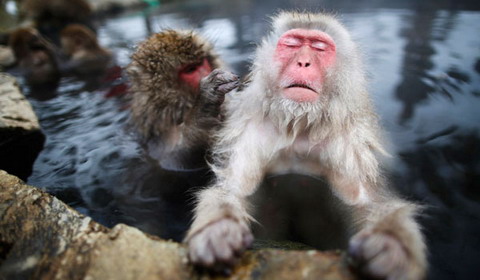 Japanese Macaques (or Snow Monkeys) groom each other in a hot spring at a snow-covered valley in Yamanouchi town, central Japan, Jan 20, 2014. [Photo/Agencies]