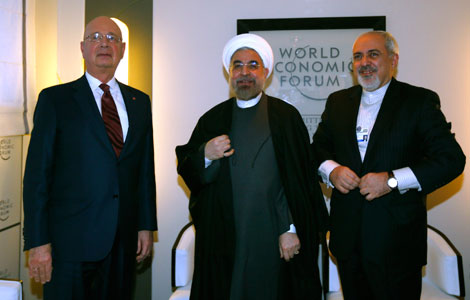 Iran's President Hassan Rouhani (R) and Iran's Foreign Minister Mohammad Javad Zarif arrive for a meeting during the annual meeting of the World Economic Forum (WEF) in Davos Jan 22, 2014. [Photo/Agencies]