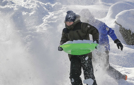 A woman stands in blowing snow on a street in the Park Slope section of Brooklyn in New York City, Jan 22, 2014. The northeastern United States on Wednesday dug out from a storm that dumped over a foot of snow in many places with frigid, windy weather keeping some schools and offices closed and flights canceled. [Photo/Agencies]