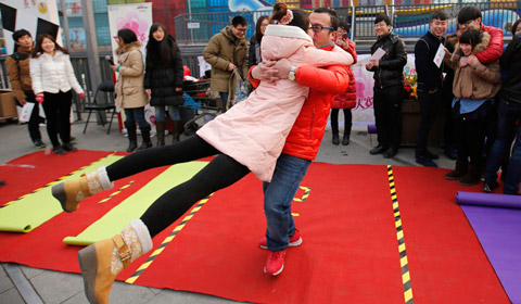Love was certainly in the air for these couples as they found a hair-raising way to celebrate Valentines Day - a NAKED bungee jump. The nine couples headed to Sigulda, Latvia where they stripped off and hurled themselves from a cable car. Despite the harsh winter weather, the loved up adrenaline junkies performed the jump over the frozen river Gauja, wearing little more than a g-string and a safety harness. And if the jump wasnt brave enough, the lovers had to stay in their birthday suits for 15 minutes before the jump. [Photo/icpress.cn]
