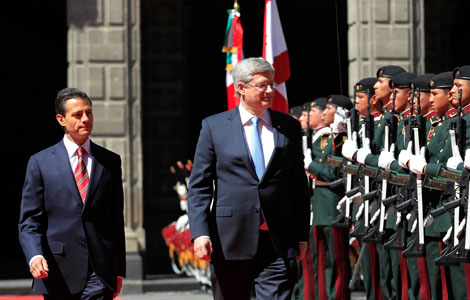 Canada's Prime Minister Stephen Harper waves as he step off a plane upon arrival at the presidential hangar in Mexico City Feb 17, 2014, in this handout photograph provided by the Mexico's Foreign Ministry. Harper is on a two-day visit to Mexico. [Photo/Agencies]