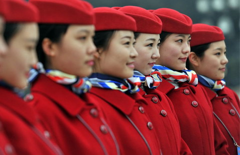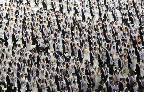 Newlyweds attend a mass wedding ceremony at the Unification Church in Gapyeong, about 60 km (37 miles) northeast of Seoul Feb 12, 2014. The Unification Church founded by evangelist reverend Moon Sun-myung in Seoul in 1954, performed its first mass wedding in 1961 with 33 couples. Approximately 2,500 couples attended the mass wedding on Wednesday. [Photo/Xinhua]