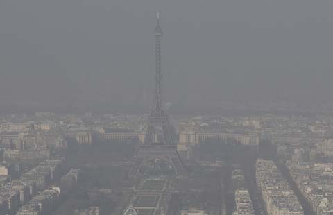 A general view shows the Eiffel tower and the Paris skyline through a small-particle haze from the Parc de St-Cloud, near Paris March 13, 2014 as warm and sunny weather continues in France. Residents and visitors to Paris basking in a streak of unseasonable sunshine were also being treated with a dangerous dose of particles from car fumes that pushed air pollution to levels above other northern European capitals this week. Swathes of France, including the French capital, were on maximum alert over air pollution on Thursday, prompting Paris authorities to make green transportation such as its Velib bike-share and the Autolib electric car fleet free for the day. [Photo/Agencies] |