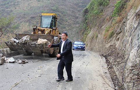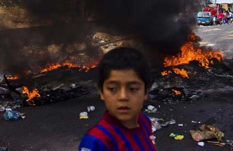A resident carries her child near a barricade during a demonstration in Iquique, Chile, on April 5, 2014. Residents from Laguna Verde of Iquiqu took part in the demonstration demanding more help for the people affected by the 8.2 magnitude earthquake that affected the north of Chile on April 1. [Photo/Xinhua] |