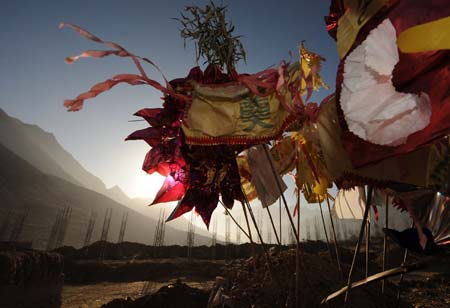 Updated: 2008-12-11 10:20 The steel bars of the new houses are seen behind the sacrifices to the dead in the earthquake in Luobozhai Village of Yanmen Township, the quake-hit Wenchuan County, southwest China's Sichuan Province, Dec. 8, 2008. Luobozhai, less than 10 kilometers from the county seat, is the biggest Qiang ethnic village existing in China. The village was once the capital of the ancient Qiang King and then called "the city upon the clouds". The houses in the village were built of soil, joining with each other and forming up the whole village as one. However most of the soil-built houses collapsed due to the May 12 earthquake, which killed 48 people here. The Qiang ethnic villagers used wood and bamboo mattings to build up temporary houses after the quake, and received food and winter necessities from the local government. The new houses donated by Jiangmen City of Guangdong Province are under construction at present. All the new houses can resist 8.0-magnitude earthquake and will be covered with soil to keep the village's traditional outlook.[Xinhua] |