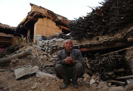 Zhang Xianzhong, a resident of Luobozhai, poses for a photo in front of his house collapsed in the earthquake, in Luobozhai Village of Yanmen Township, the quake-hit Wenchuan County, southwest China's Sichuan Province, Dec. 8, 2008. Luobozhai, less than 10 kilometers from the county seat, is the biggest Qiang ethnic village existing in China. The village was once the capital of the ancient Qiang King and then called "the city upon the clouds". The houses in the village were built of soil, joining with each other and forming up the whole village as one. However most of the soil-built houses collapsed due to the May 12 earthquake, which killed 48 people here. The Qiang ethnic villagers used wood and bamboo mattings to build up temporary houses after the quake, and received food and winter necessities from the local government. The new houses donated by Jiangmen City of Guangdong Province are under construction at present. All the new houses can resist 8.0-magnitude earthquake and will be covered with soil to keep the village's traditional outlook.[Xinhua]