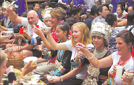 Updated: 2008-12-11 16:19 Tourists enjoy their get-together with local people of ethnic minorities in the Guangxi Zhuang autonomous region. Over the years both the Beijing and Guangxi governments have invested heavily in infrastructure of local poverty-stricken villages and towns, facilitating the development of tourism and bringing those ancient lifestyle to the limelight. |
